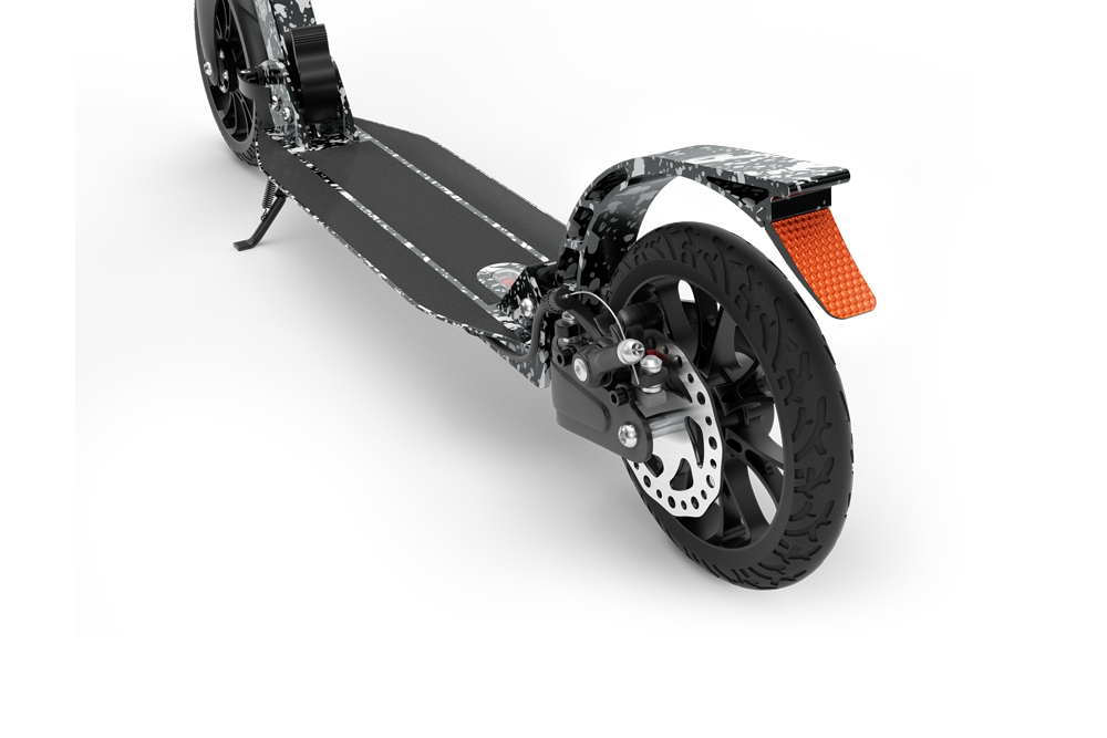 The scooter is equipped with fenders on both front and back wheels, this is a must when commuting to avoid any backsplash on your outfit.