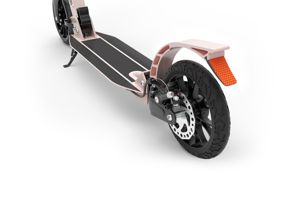 The scooter is equipped with fenders on both front and back wheels, this is a must when commuting to avoid any backsplash on your outfit.